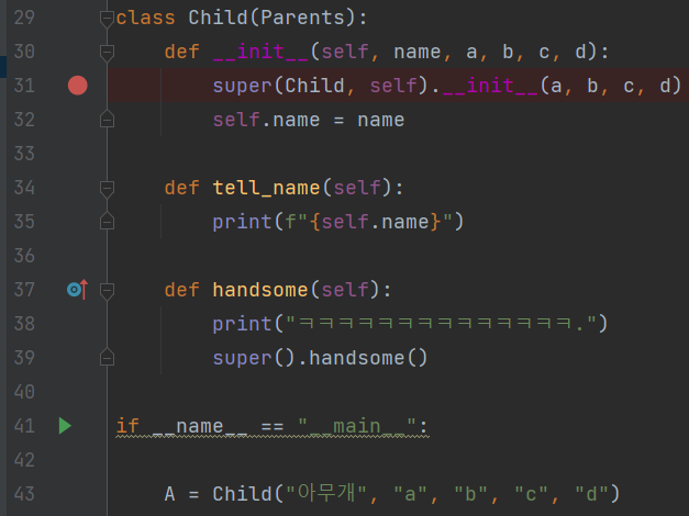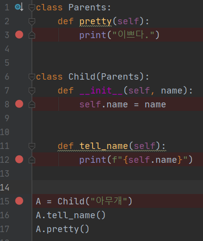 5) 15 Line에서 첫번째 파라미터인 name에 "아무개"를 전달하기 위해 A변수에 Child("아무개")클래스를 생성자로 선언합니다. 이때 Child 클래스가 생성됨과 동시에 def __init__ 메서드에 접근되어 해당 하위 내용을 수행합니다.