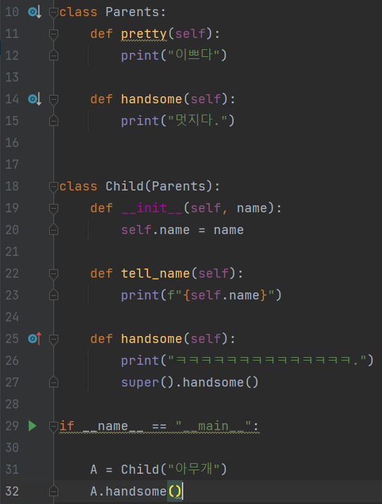 - 출력내용: Child 클래스의 handsome() 메서드에 접근해서 "ㅋㅋㅋㅋㅋㅋㅋㅋㅋㅋㅋㅋㅋㅋ."을 출력하고 super().handsome()에서 Parents 클래스의 handsome() 메서드로 접근되어 "멋지다"를 출력한다.