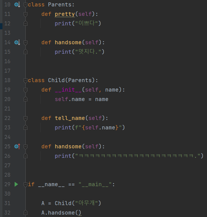 - 출력내용: ㅋㅋㅋㅋㅋㅋㅋㅋㅋㅋㅋㅋㅋㅋㅋㅋㅋㅋㅋㅋㅋ. <- 출력됨으로 부모 클래스의 handsome()메서드는 자식 클래스의 handsome() 메서드에 덮어씌워져 자식 클래스의 handsome() 메서드가 호출됨.