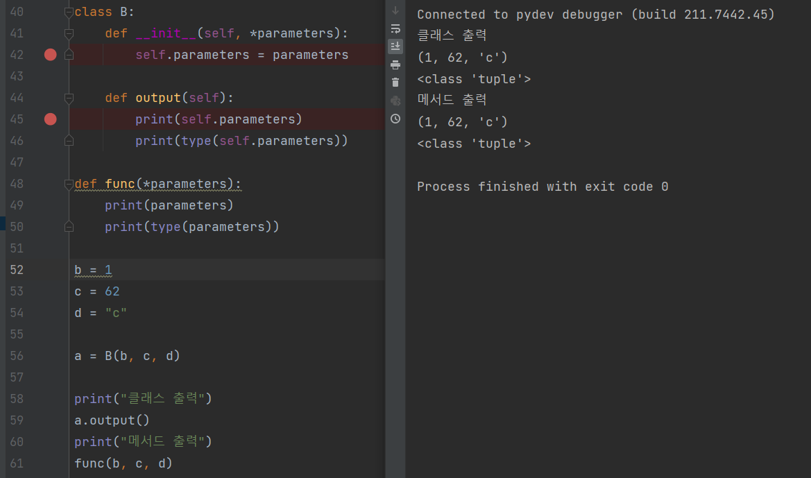- 저 func 메서드와 B 클래스의 변수를 *parameters로 선언해놓고 여러인자 (b ,c, d)를 전달하면 3가지 원소를 가진 하나의 tuple 객체(1, 62, 'c')가 생성된다.