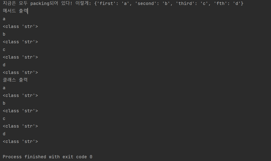 - 키워드를 "Unpacking" 할때는 전달하는 Dict의 "Key" 변수와 클래스나 메서드에서 정의한 변수의 이름을 같게해야합니다! 그래야 작동합니다. alpabat의 key 값인 first, second, third, fth를 메서드와 클래스 변수명과 일치 필요!