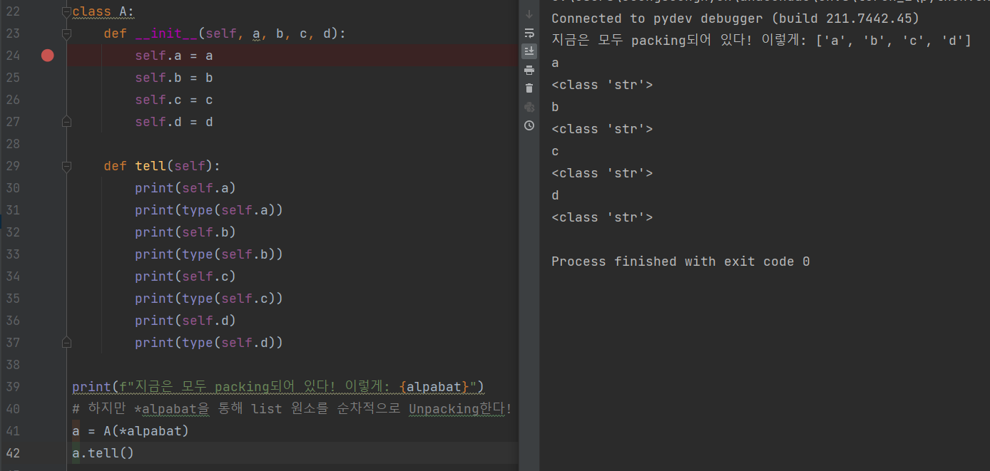 - 인자를 Unpacking 하는 방법은 *를 메서드나 클래스에 전달할 변수 앞에 붙여주면 됩니다.
