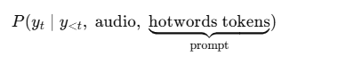 - hotwords 토큰들이 prompt에 포함되면, 이들이 디코더의 쿼리·키·값 계산에 영향을 주어 "고유 명사"가 나올 확률이 상대적으로 올라갑니다.